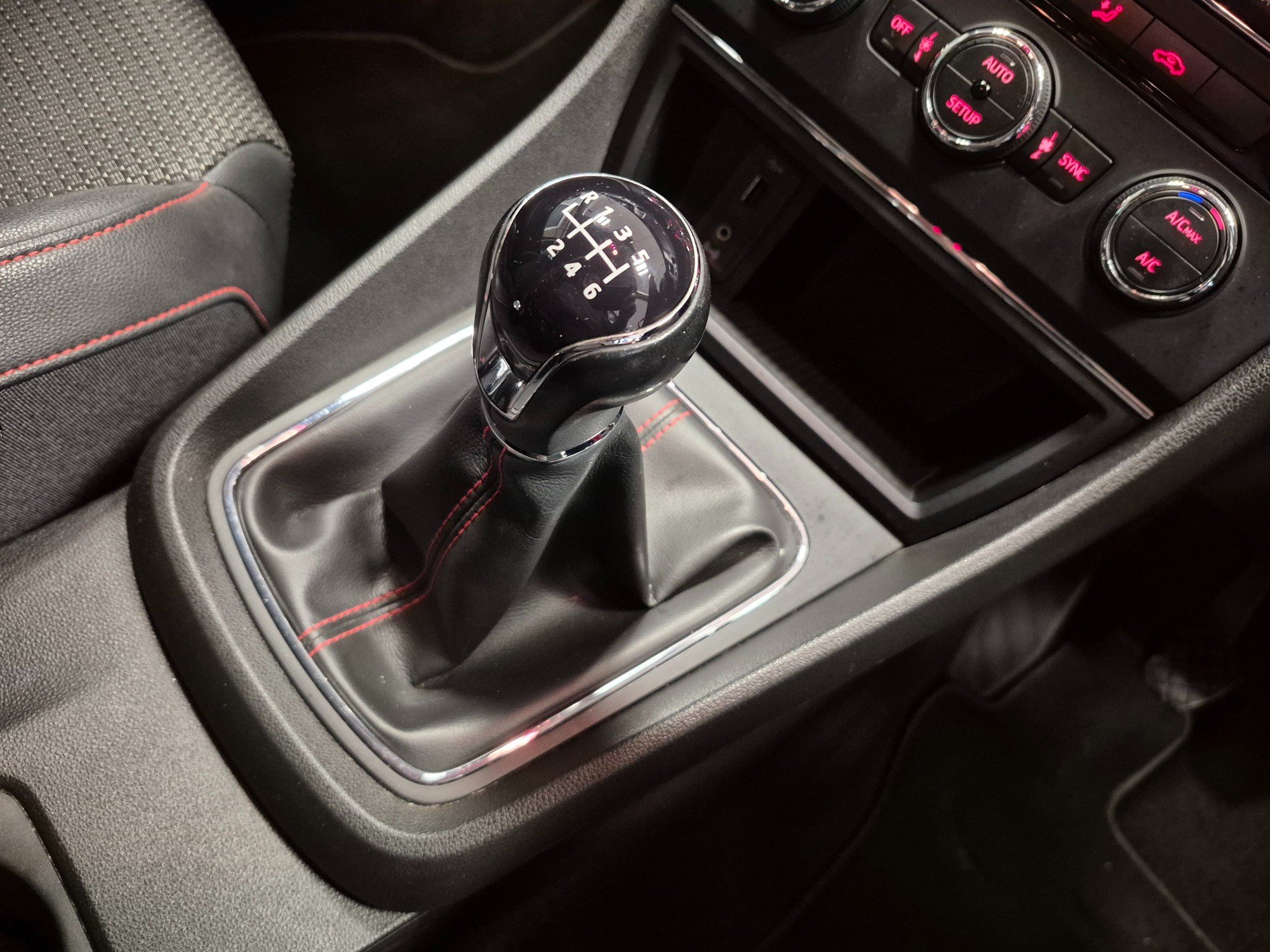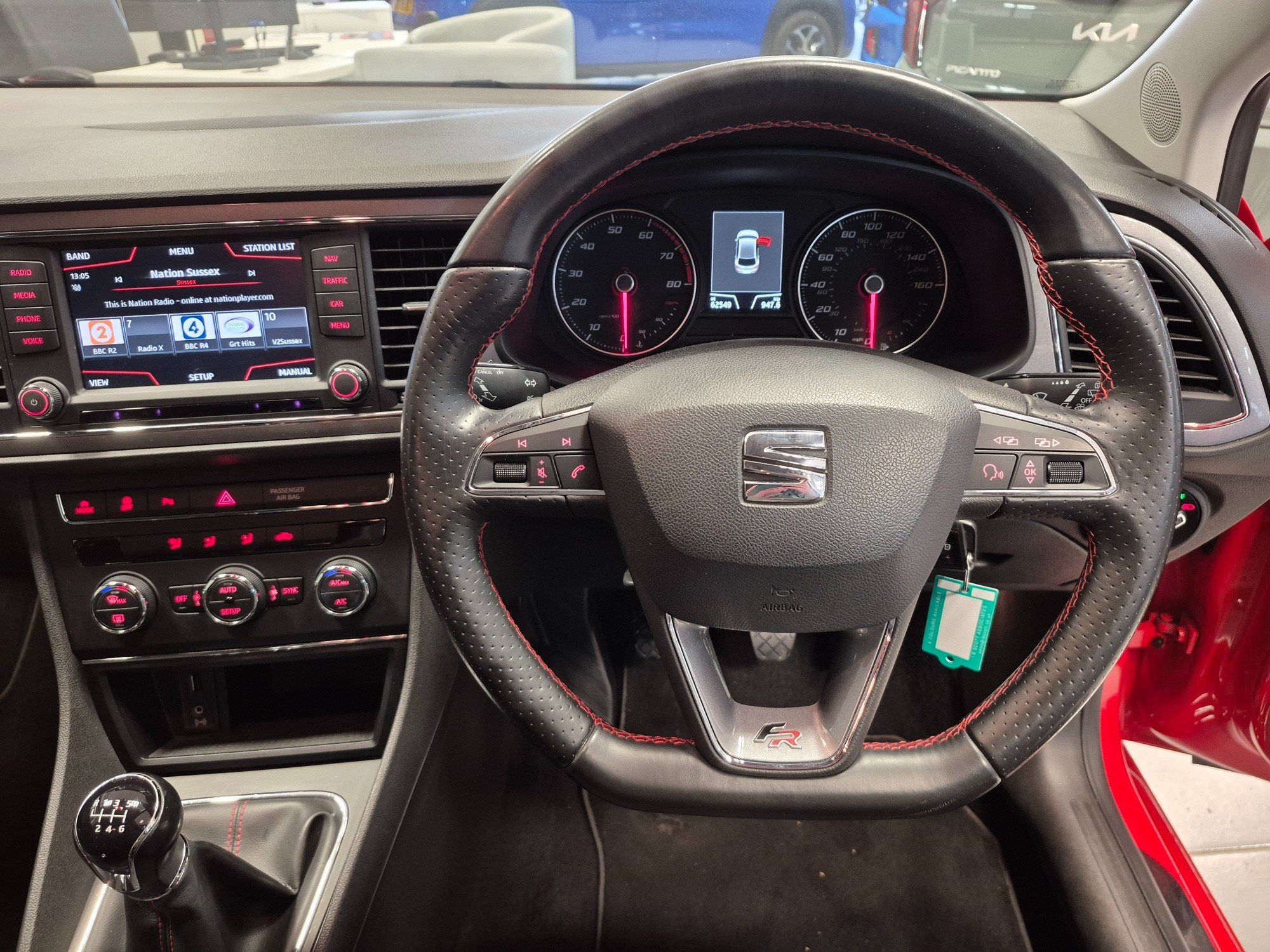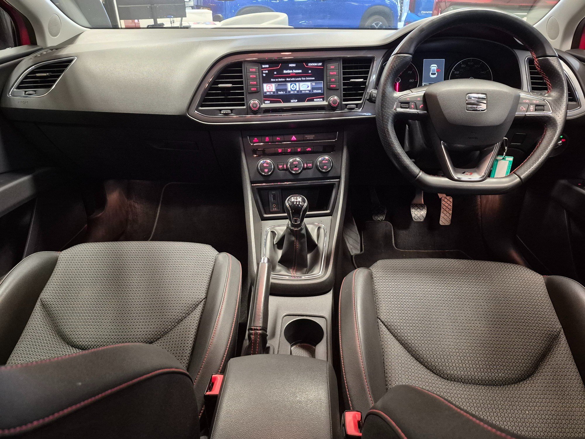 - Steering Wheel - Flat-Bottomed Perforated Leather with Red Stitching and FR Logo